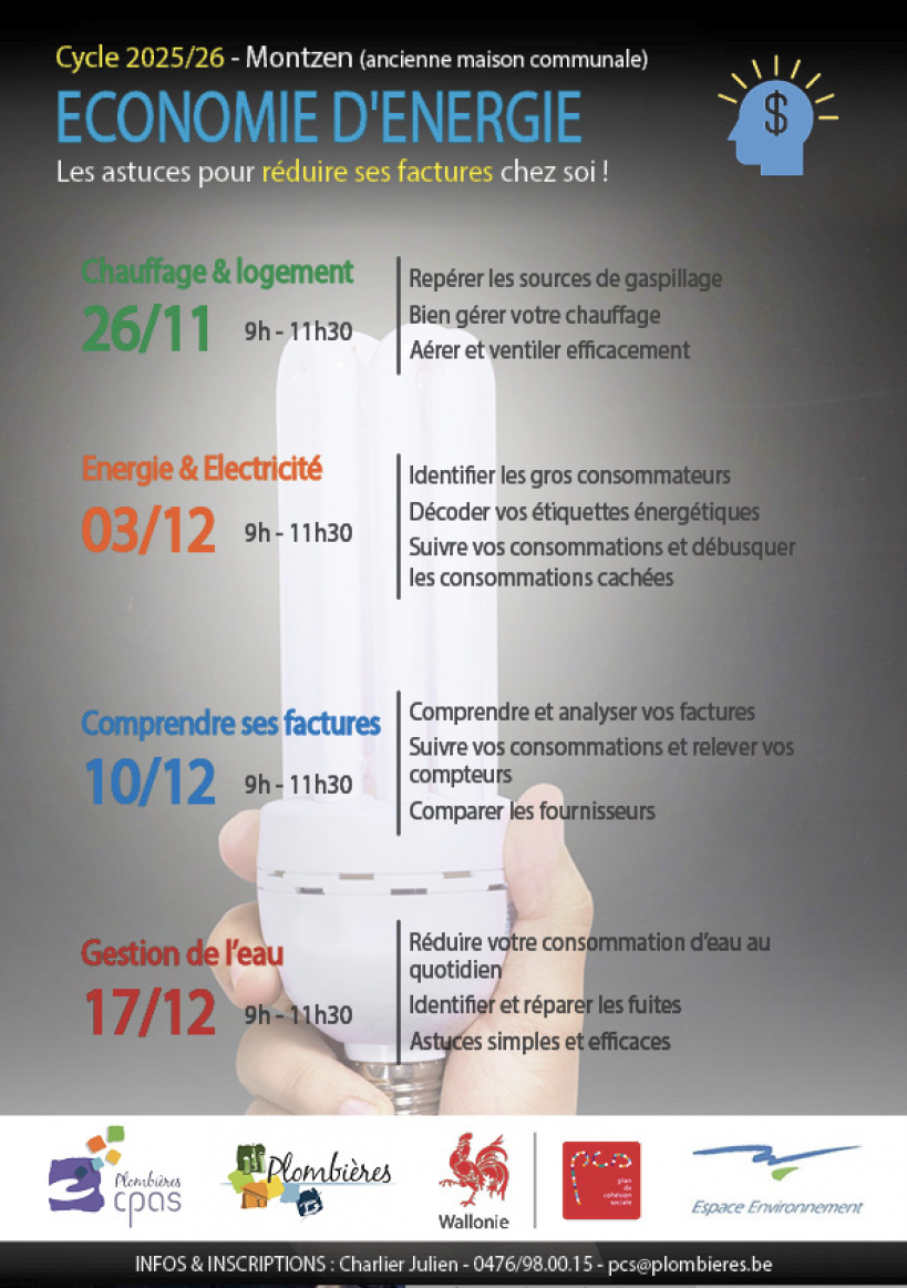Cycle d’ateliers pratiques intitulé « Économie d’énergie – Les astuces pour réduire ses factures chez soi », qui se déroulera à Montzen (ancienne maison communale) les 26 novembre, 3, 10 et 17 décembre, de 9h à 11h30.