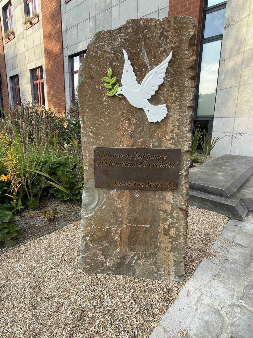 Le monument est également revêtu d’une citation de Jean-Pierre Malmendier : « La haine ne doit jamais être le moteur d’un combat. »Ce monument de la paix doit nous rappeler l’importance et la fragilité de la paix, mais également l’importance de la tolérance.